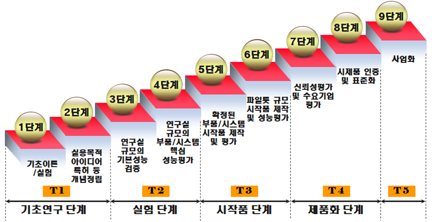 ㅇ (기술성숙도) 개발기술의 시작과 종료시점에서의 기술적인 목표달성 정도를 보다 효과적으로 표현하고 평가하기 위해 핵심요소기술의 기술적 성숙도에 대한 객관적인 지표로 9단계로 구분(기초실험~사업화)