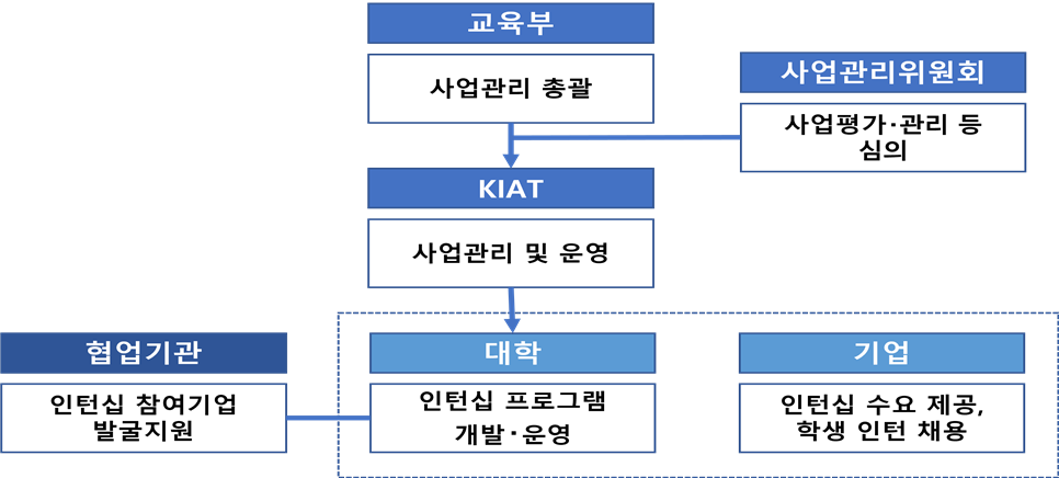 ○ 운영방식 : 대학별로 기업과 학생을 연계하여 인턴십 사업계획을 제출, 선정평가를 통하여 대학별 학생 지원 규모 결정