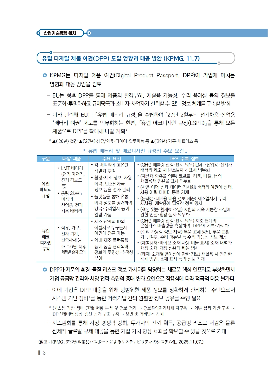 [2025년 23호] (정책동향) 유럽 디지털 제품 여권(DPP) 도입 영향과 대응 방안 (KPMG, 11.7)