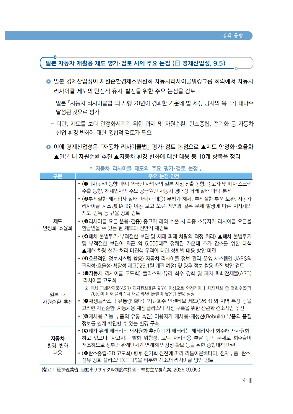 [2025년 18호] (정책동향) 일본 자동차 재활용 제도 평가·검토 시의 주요 논점 (日 경제산업성, 9.5)