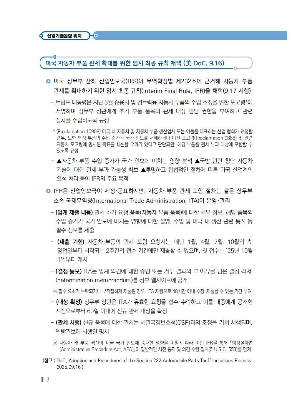 [2025년 19호] (정책동향) 미국 자동차 부품 관세 확대를 위한 임시 최종 규칙 채택 (美 DoC, 9.16)