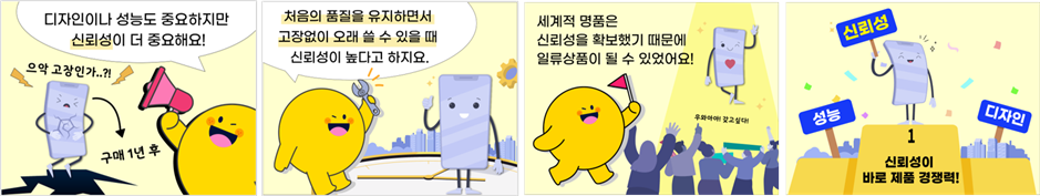 * ‘품질’이 시간 개념 없이 제품에 요구되는 성능을 발휘하는 특성이라면 ‘신뢰성’은 일정 시간 후에도 목표 수준의 품질을 유지하는 특성