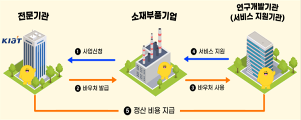 ㅇ 신뢰성 향상 및 소재 성능 향상을 필요로 하는 국내 소재부품장비 기업에게 바우처(온라인 쿠폰)를 발급하여 연구개발기관(서비스 지원기관)에서 제공하는 서비스 이용 지원