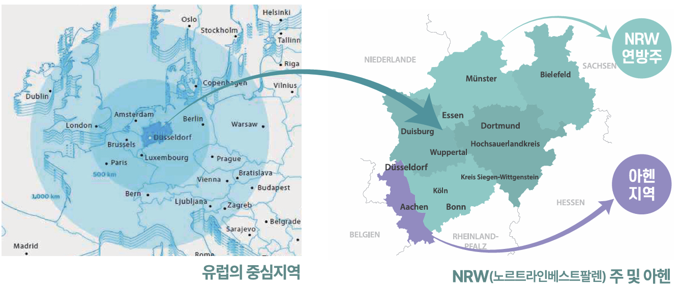 ❏ 첨단제조 집적지이며, R&D 인프라가 풍부한 독일 NRW주*에 위치 * 獨연방주 GDP/수출 1위, 종합대학 70개 , 민간연구기관 50개, R&D 네트워크 연구조직 36개 : NRW주 주변지역은 아헨대학, 프라운호퍼, 율리히 연구소 등 제조분야 260여개 연구소 보유
